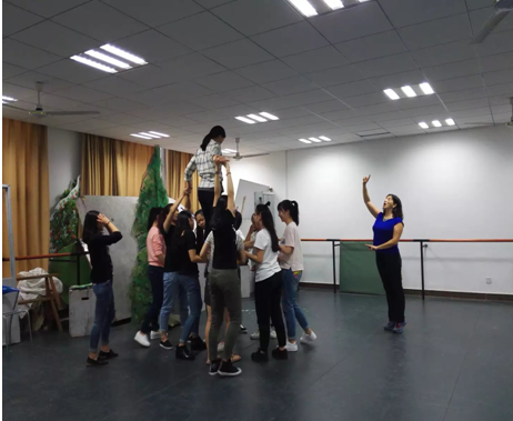 授课初始,Ebru告诉学生,每个人都是演员,都会演戏,作为学习表演专业的学生应该敢于尝试,不断挑战自己。当和同伴站在舞台上进行演绎交流时,双方注意力都必须保持高度的集中,通过仔细观察对方的言行举止,给出最及时且自然的反映,这一个过程是需要双方共同配合协作进行并完成的。因此前期的准备工作很有必要。在Ebru的要求下,每个学生找到一个搭档做演绎游戏,从视觉、听觉、触觉三个方面来锻炼学生的观察和模仿能力。比如及时反映动作模仿1,2,3练习;跟随对方引导摆动身体各个部位练习;通过触摸进行人脸识别的练习等。在进行了前期的准备练习后,Ebru向学生讲述论坛剧场的开设目的就是为了解决被压迫者与压迫者之间矛盾的问题,在表演的过程中观众可中途叫停,给演员建议甚至可以上台亲自展现,试图改变结果向他们期望的方向发展。这一项大胆的尝试是为了试图打破传统演员与观众的壁垒与隔阂关系。这种教学方式对同学们来讲形式非常新颖,使大家能全方位的把握舞台人物关系,为准确的进行人物塑造奠定了基础。