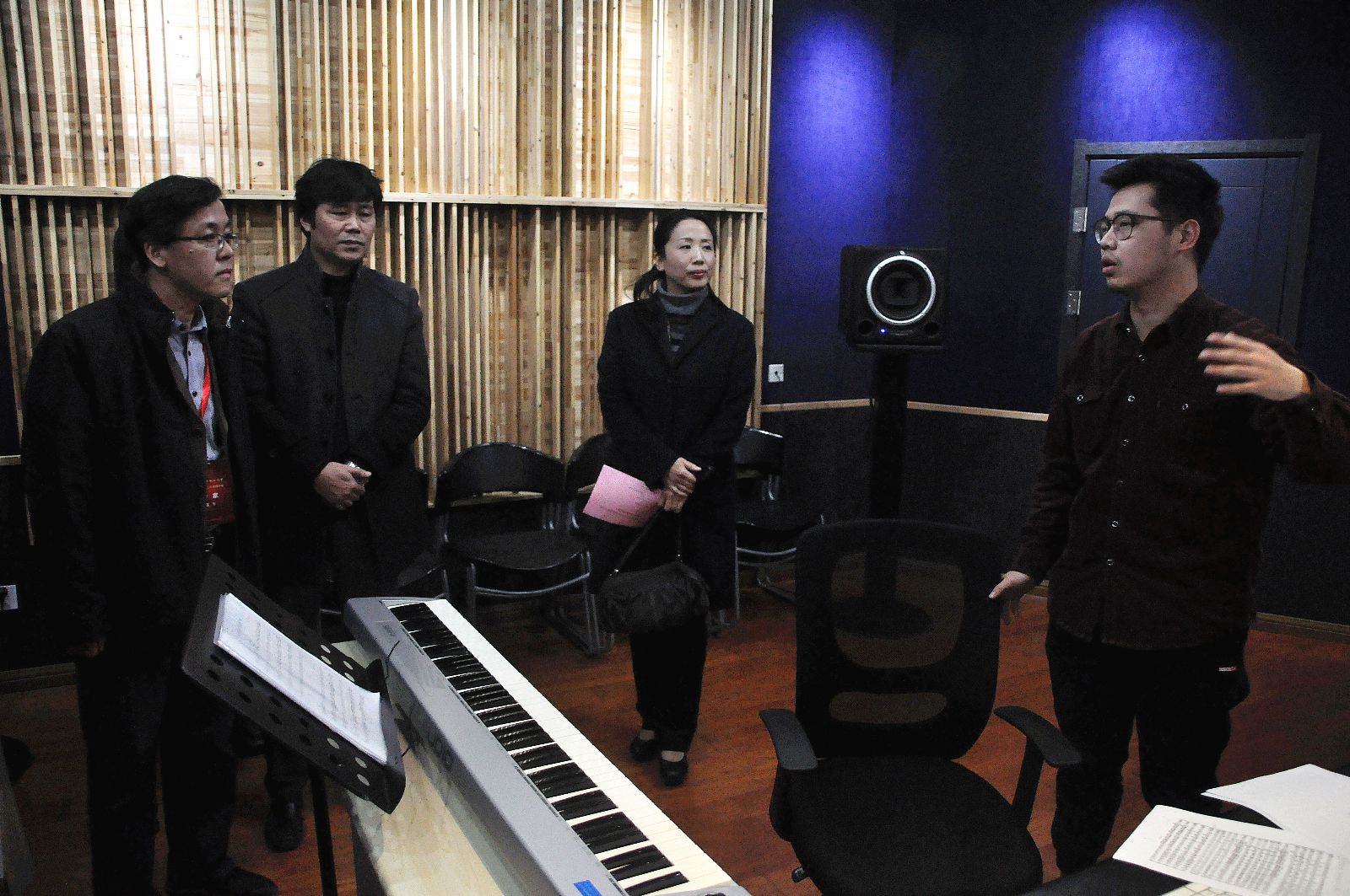 专家组考察小妲己直播 数字音乐实验室,图为工作人员向专家组介绍该实验室情况