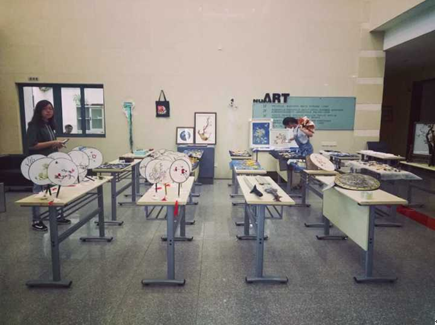 展览现场一侧的墙壁上挂着一幅幅编织作品,中间桌子上摆放着同学们的刺绣作品和首饰作品。有装裱好的绣品,团扇,屏风,布包以及各类首饰作品,风格各异,形式多样,十分吸引眼球,如任一鸣的《桃花与鸟》、王佳颖的《风荷举》、黄韵�与张琦的《清浅》。除此之外,还有各类兵器模型作品,利用马粪纸和粘土,重新设计,组装,改装,打磨,上色,制作成一个个精美,壮观的兵器。这些作品凝聚了同学们的智慧,获得老师一致好评。