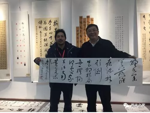 邱世鸿是早期毕业于西南师大书法硕士点的研究生,多次应邀到书法所讲座和笔会。他赞同书学的跨学科研究,也特别关注文化产业,将西师流派之精神贯彻到教学和实践中。在三北艺术中心观看名家邀请展览时,邱老师即兴作联“古篆精神仙鹤老,名山事业丽文新”,前句言艺术之永春,后句言著述之久长。在笔会上,邱世鸿篆以 “明道乐心学以致用” 八字长卷,并作熊猫水墨画。随后,作为文学院客座教授的邱世鸿博士,以草书东坡诗赠王本朝院长,以示合作之和谐。在文学院研究生教室举办的师生座谈会上,曹建教授阐述了研究所的研究方向和近期目标,邱世鸿教授为书法所篆题了“名山事业,古篆精神”。