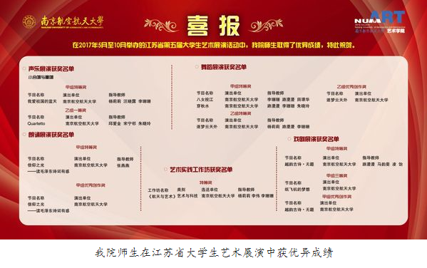 学院师生还先后参加了全国美展、“挑战杯”中国大学生创业计划大赛、全国青年普通话竞赛、CUBA全国大学生篮球赛、全国大学生艺术展演、江苏省大学生艺术展演活动、国家汉办主办的中外交流活动、长三角青年声乐比赛、上海国际舞台美术学术会议作品展、布拉格国际舞台美术作品展览、中国美术作品展和中国当代篆刻艺术大展等重要展演活动并获得奖项百余项,在国内外文化艺术舞台上镌写着南航的艺术名片。