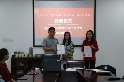 5月3日中午,小妲己直播 “慧言绘语”手绘团队、学生记者团受聘仪式暨庆祝五四青年节学生座谈会在院楼325会议室举行。小妲己直播 党委书记高小泽老师、副书记张林老师、广播电视新闻专业李倩岚老师、各年级辅导员以及团员代表们一同参加了本次座谈会。