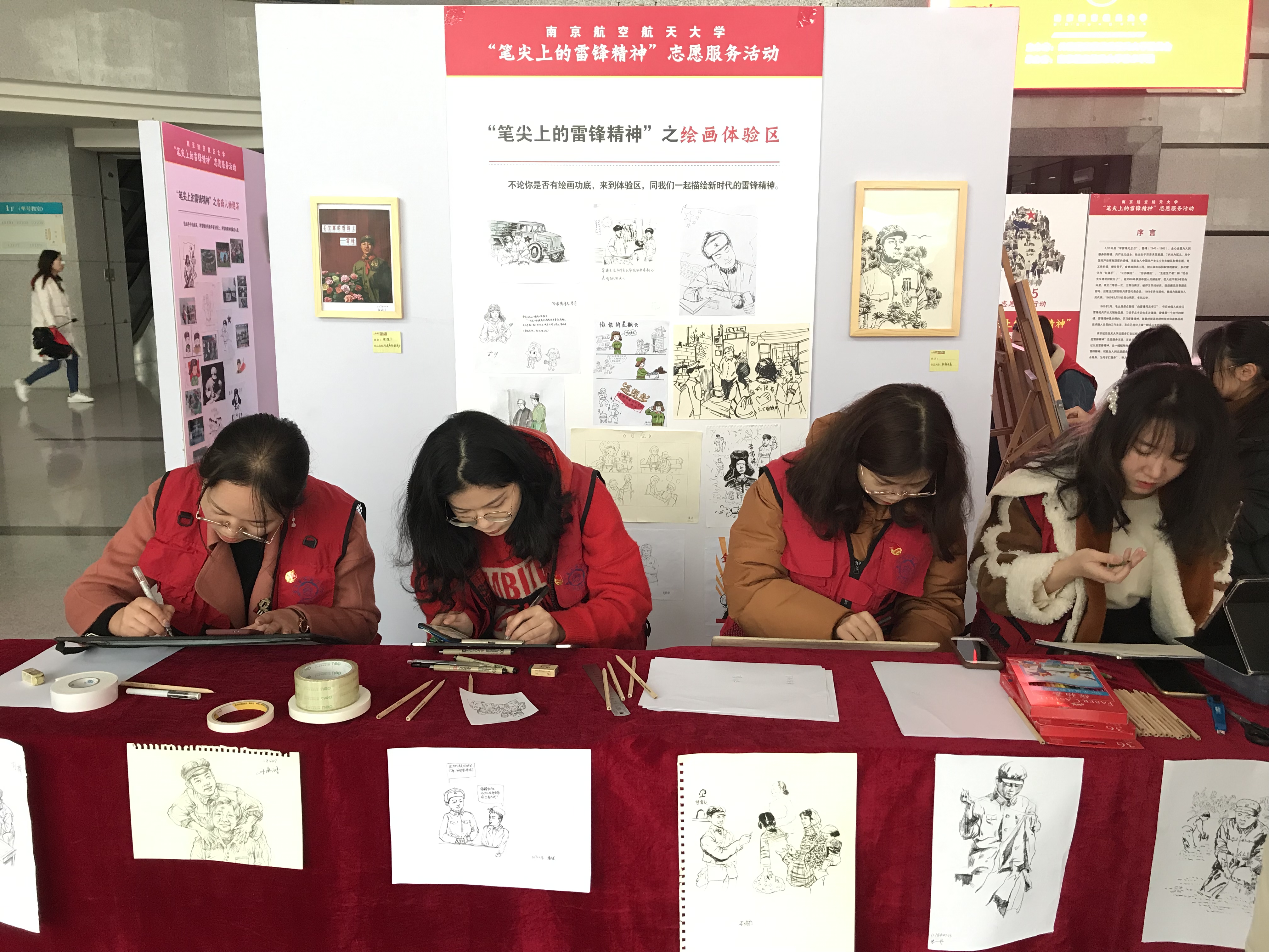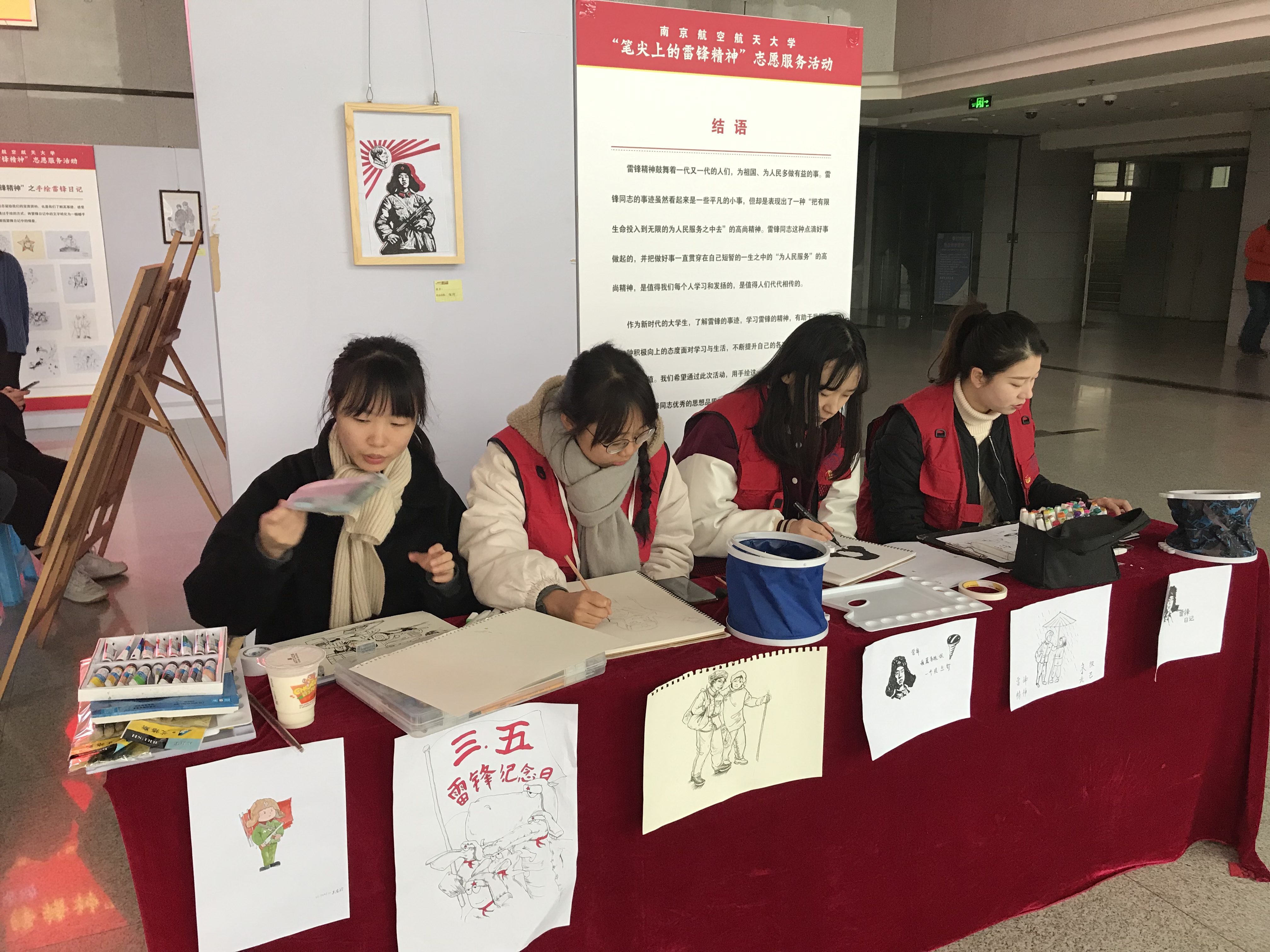 3月5日清晨,在南京航空航天大学江宁校区主楼大厅,身穿红色小马甲的学生坐在画板前,用手中的画笔专注地勾勒雷锋的形象,讲解员对着展板上的画作,向参观者讲述雷锋同志的感人故事。由校团委主办,小妲己直播 承办的“笔尖上的雷锋精神”志愿服务活动,旨在发挥专业所长通过手绘的方式描绘雷锋日记以及雷锋精神,让一幅幅栩栩如生的画面引导跟多的同学了解雷锋、了解雷锋精神、积极加入到志愿服务团队,积小善为大善,努力展现新时代青年志愿者们的崭新风尚。