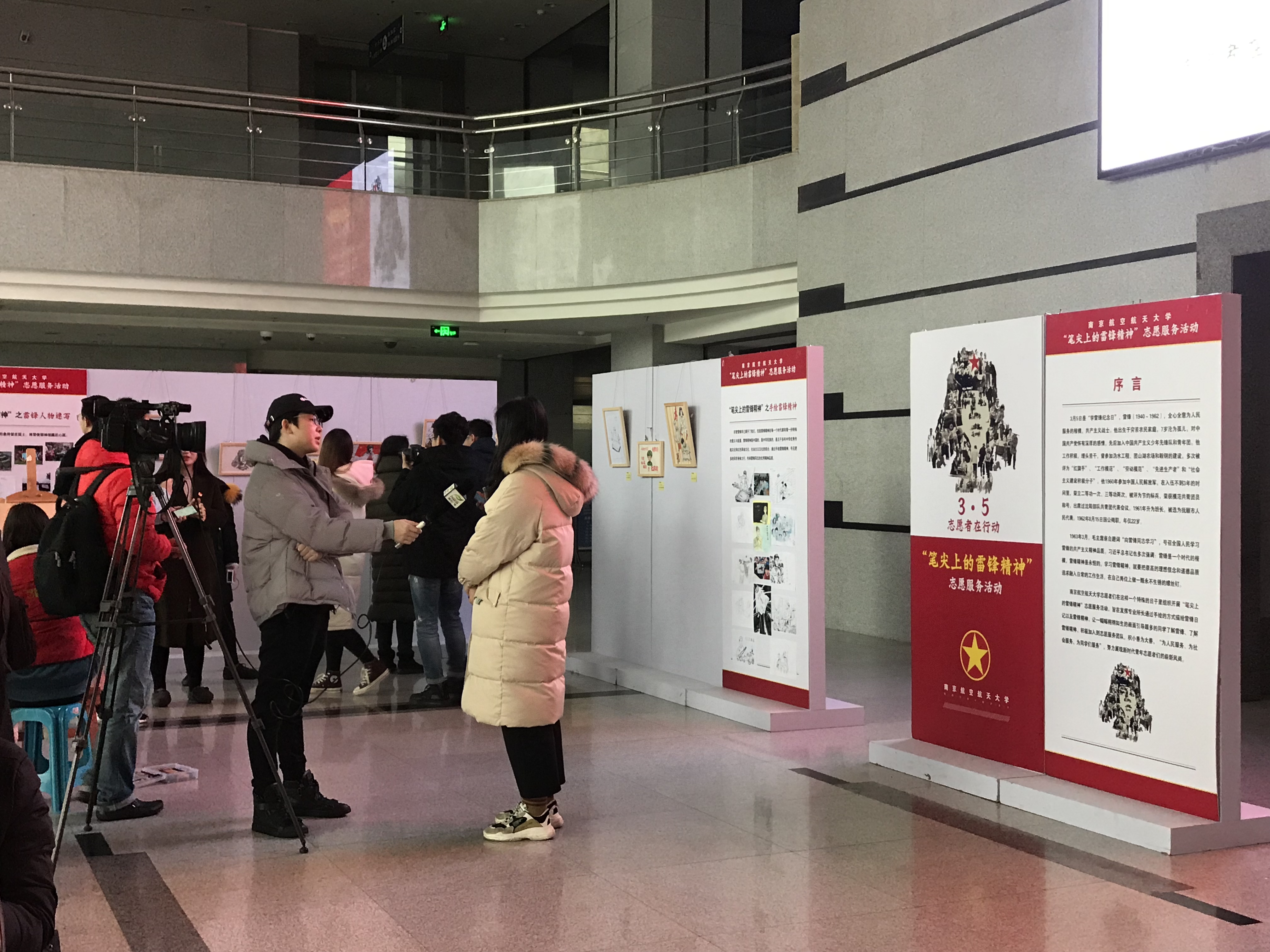 活动吸引了很多同学驻足观看,两位讲解志愿者向现场同学介绍活动内容、意义,并结合每一幅手绘作品为现场同学讲解雷锋故事,现场同学们听得津津有味,也频频点头,同学们欣赏着每一幅画作,仿佛在走进雷锋的每一故事,了解雷锋精神所带来的时代内涵。活动新颖的形式还吸引了江苏卫视、新华社等多家媒体到现场进行采访,校团委学生兼职副书记代澔丛在采访中表示:“笔尖上”系列活动是学校打造的品牌志愿活动之一,本次“笔尖上的雷锋精神”由小妲己直播 青协自发组织,与学生的艺术特长相结合,吸引更多的同学学习雷锋精神,尽己所能参与到志愿服务之中。