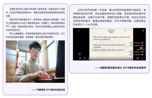 “虽然教学活动在线上开展,但教学质量及相关要求不会降低。请同学们按时上课,认真学习,也请老师们严格执行考勤制度,尽可能以多种平台交互的方式顺利推进教学活动。期待疫情早日结束,尽早恢复正常的教学与生活。祝同学们、老师们及你们的家人健康吉祥,生活愉快!”23日,学院院长板俊荣通过学院官微向师生们做了鼓舞人心的新学期致辞,系主任路漫漫、李伟、蔡雁彬老师也都寄语学生,希望同学们停课不停学,宅家不放松,尽快调整好作息时间,认真按照课表参加线上学习,按时完成作业和练习,精神饱满地投入到新的学习征程。
