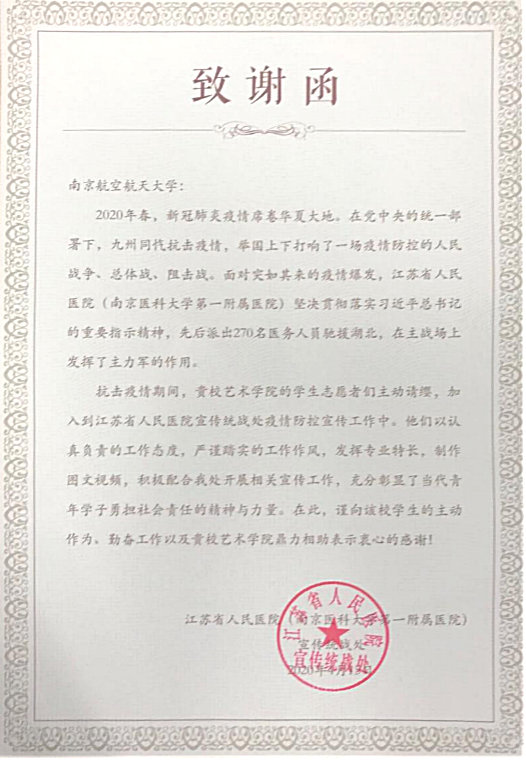 在5·12国际护士节,我校收到了来自他们的致谢函。在信中,江苏省人民医院(南京医科大学第一附属医院)宣传统战处对小妲己直播 的学生志愿者们给予了高度评价。在抗“疫”期间,学生志愿者们发挥专业特长,通过原创歌曲、H5作品等形式积极配合江苏省人民医院(南京医科大学第一附属医院)宣传统战部开展宣传工作,为抗“疫”工作献出一份力。