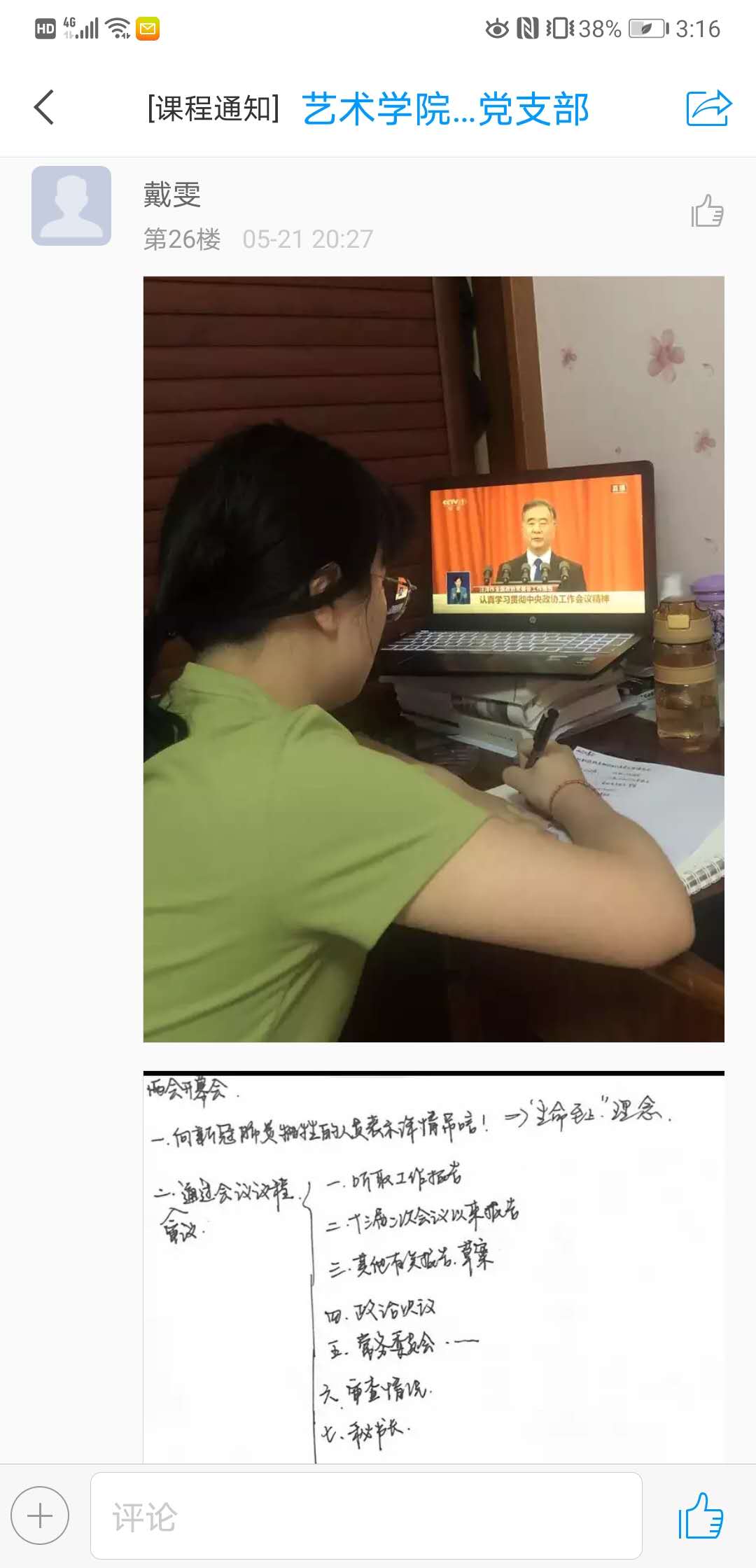 同时,各团支部书记也积极组织支部成员相约在宿舍、在家中、在腾讯会议共同收看会议直播,并认真做好学习记录,分享学习心得。