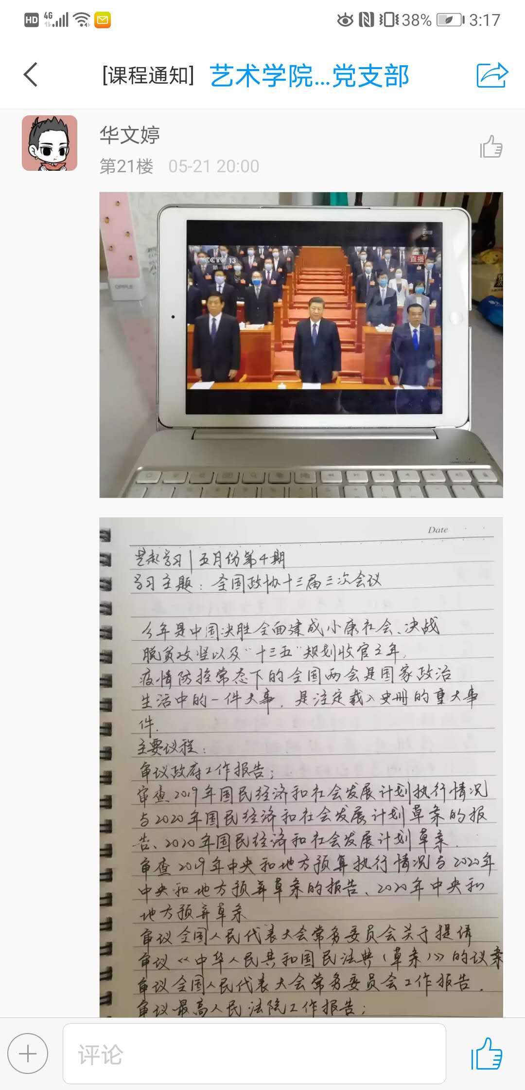 同时,在教工党支部的组织下,部分教工党员在家观看了两会开幕式直播。
