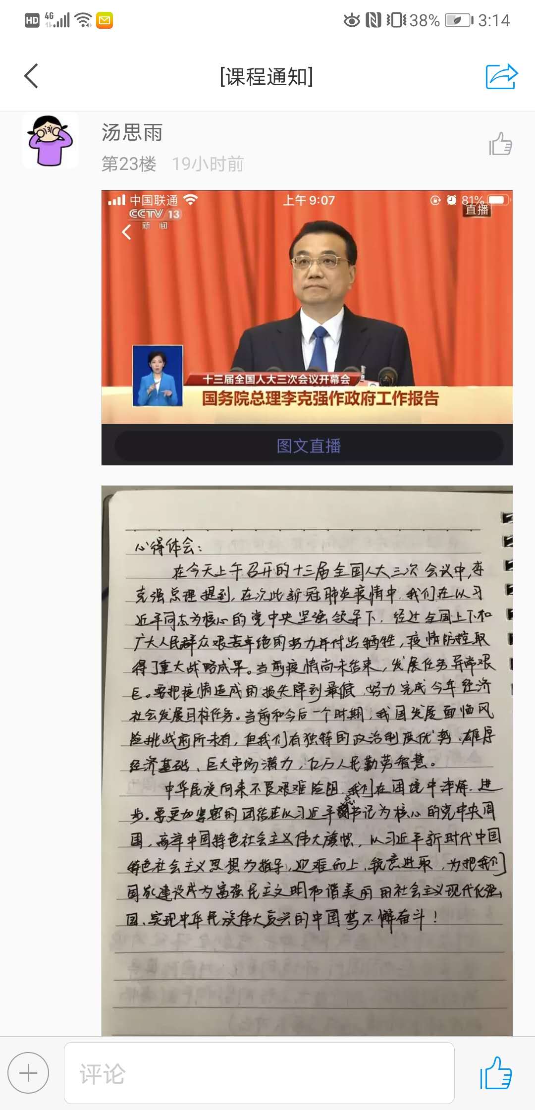党员学导在学习两会的过程中,充分发挥思想引领作用,在线分享两会知识、传达两会精神。同学们积极参加,写下了自己的感悟和心得。