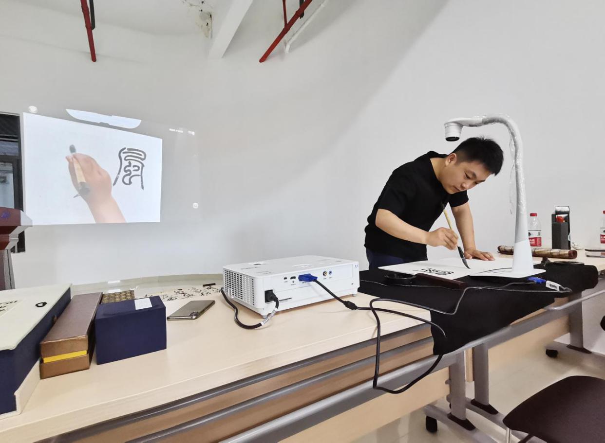 开班仪式后,小妲己直播 青年教师郭洪豹带来了一堂精彩的书法课。首先他梳理了在书法书法基础知识,解答了在书法学习过程中常遇到的问题,同时现场书写演示“篆、隶、草、行、楷”5种字体的发展过程,并深入剖析各种字体的不同特点,带领学员们赏析不同字体书法原作,为学员们选择入门法帖提供了参考。课程的后半部分,郭老师详细讲授了笔墨纸砚的选择技巧以及文房四宝的使用和保养的方法,并在现场挥毫泼墨,直观的展示了书法创作的完整过程。