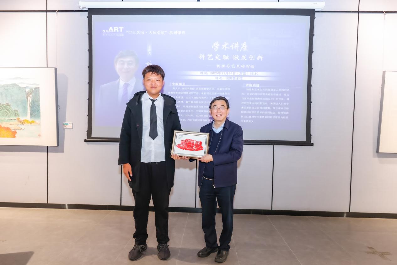讲座现场,学生代表向施大宁教授赠送了由学院学生与校企实习基地单位共同创作的铜艺工艺品及学生自己设计制作的剪纸作品,体现了艺术学子的专业素养与真挚敬意。